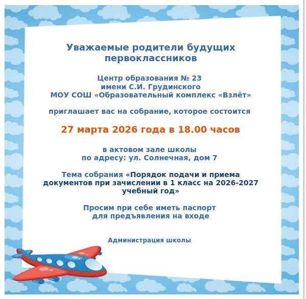 09.03.2026 Родительское собрание будущих первоклассников в Центре образования № 23 им. С. И. Грудинского